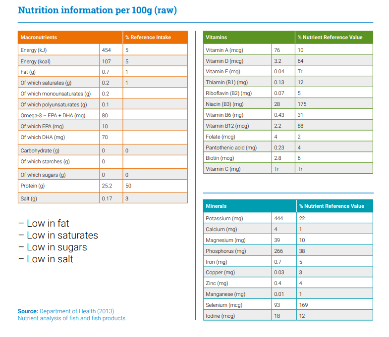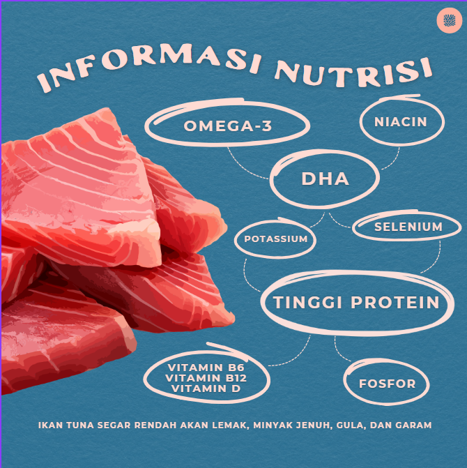 Ikan tuna segar mengandung Omega-3, DHA, dan potassium, serta mengandung konsentrasi tinggi protein, niacin, vitamin B6, vitamin B12, vitamin D, fosfor, dan selenium